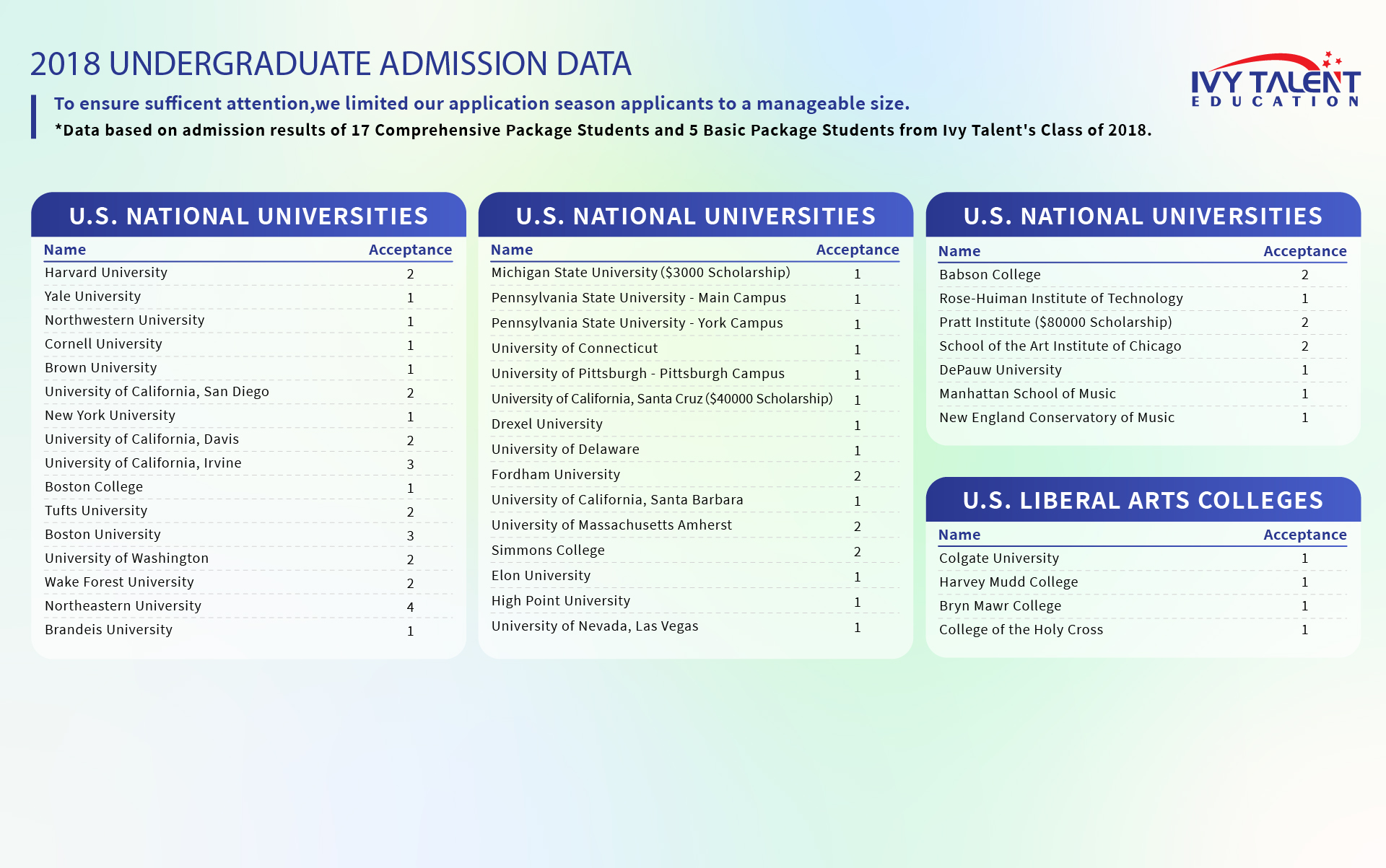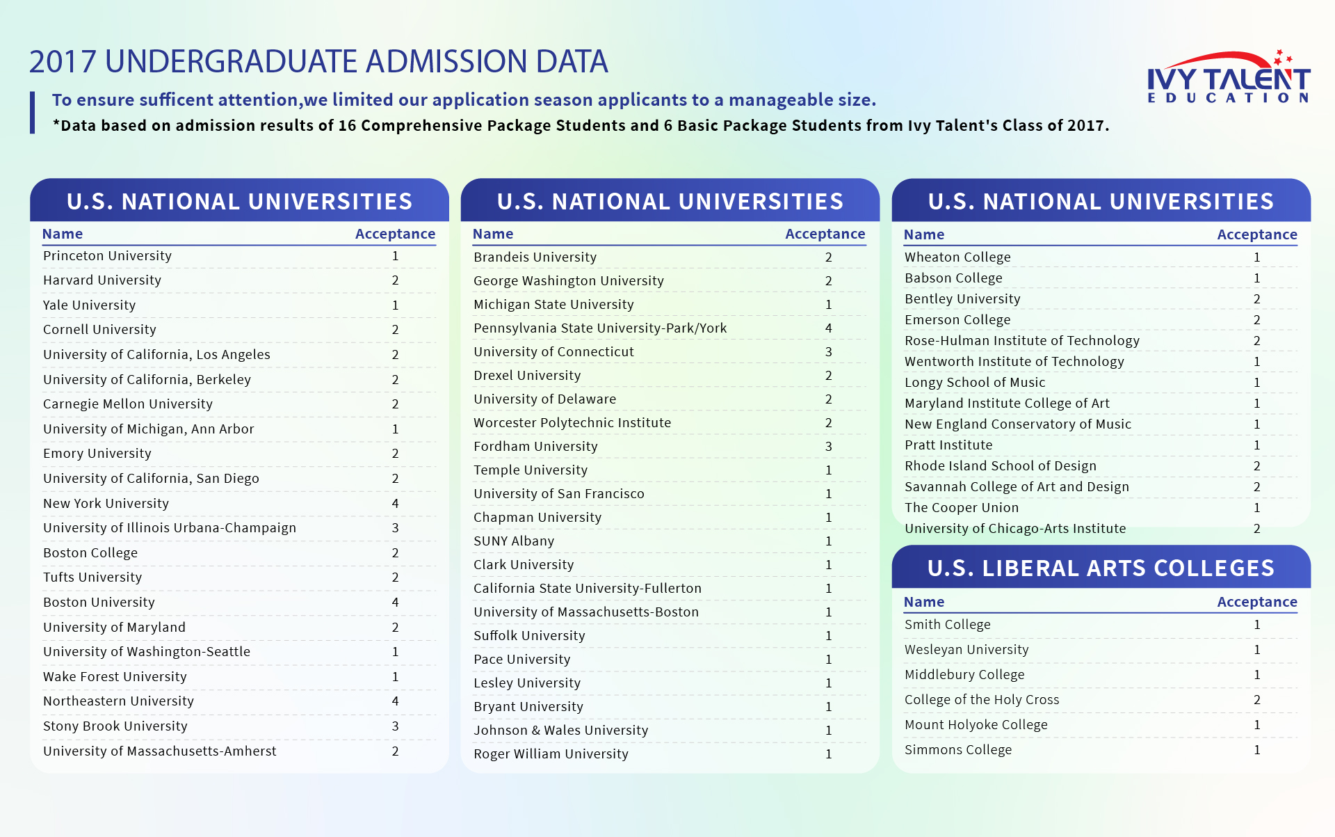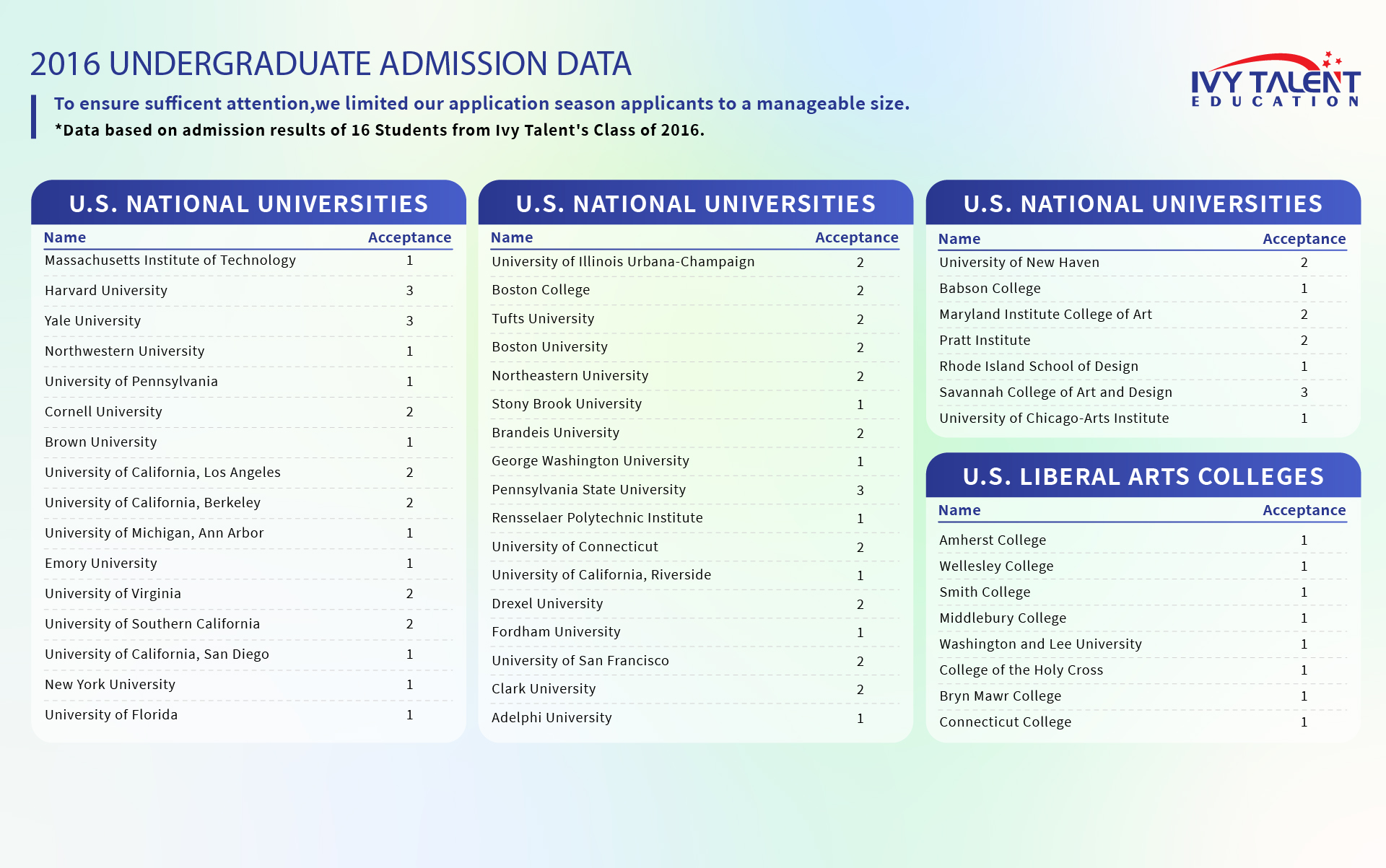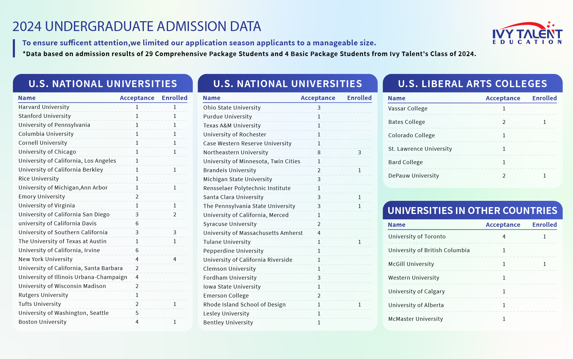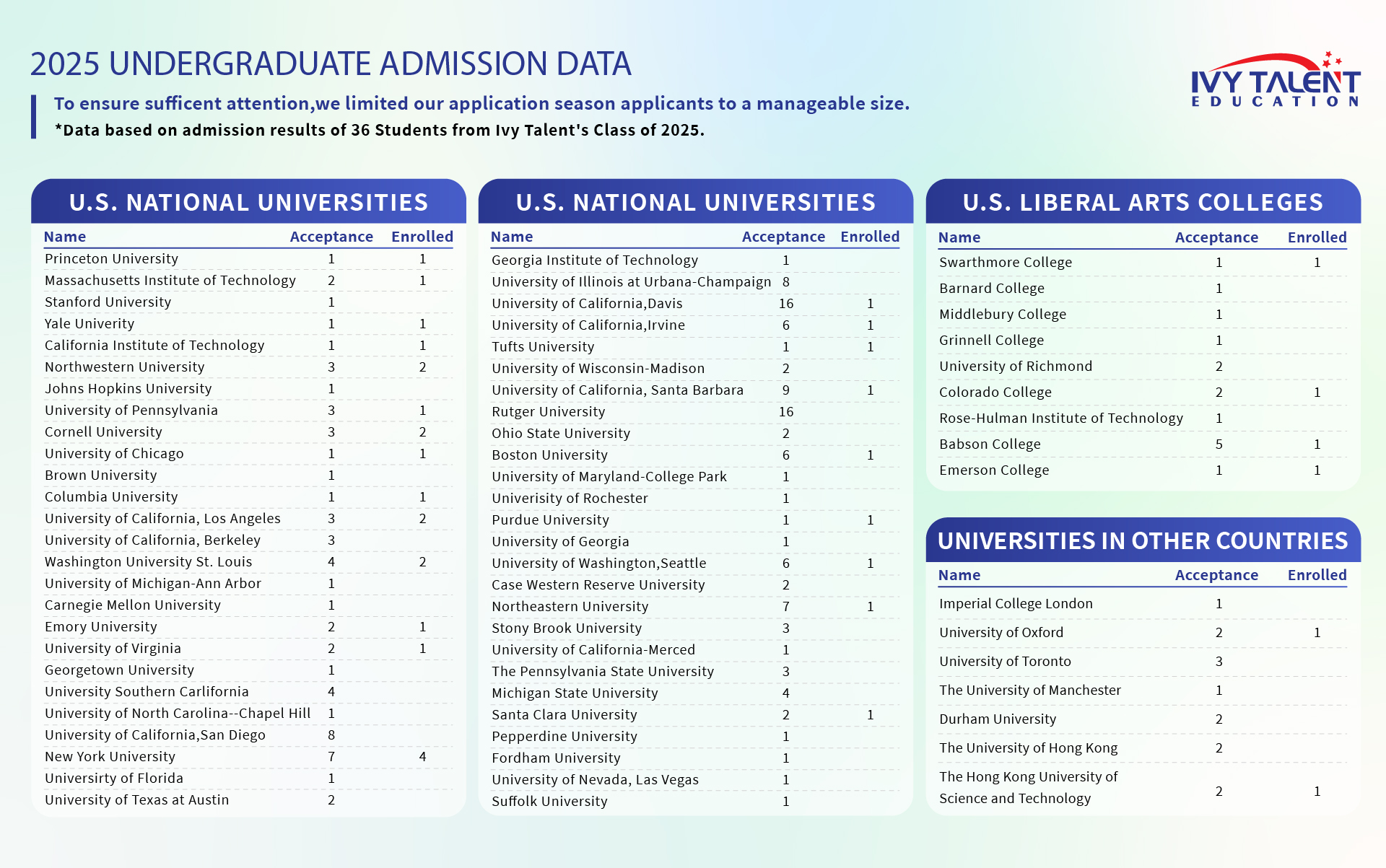 To ensure transparency and relevance, we only list college acceptances from the past five years, as admission standards and competitiveness can change significantly over time.