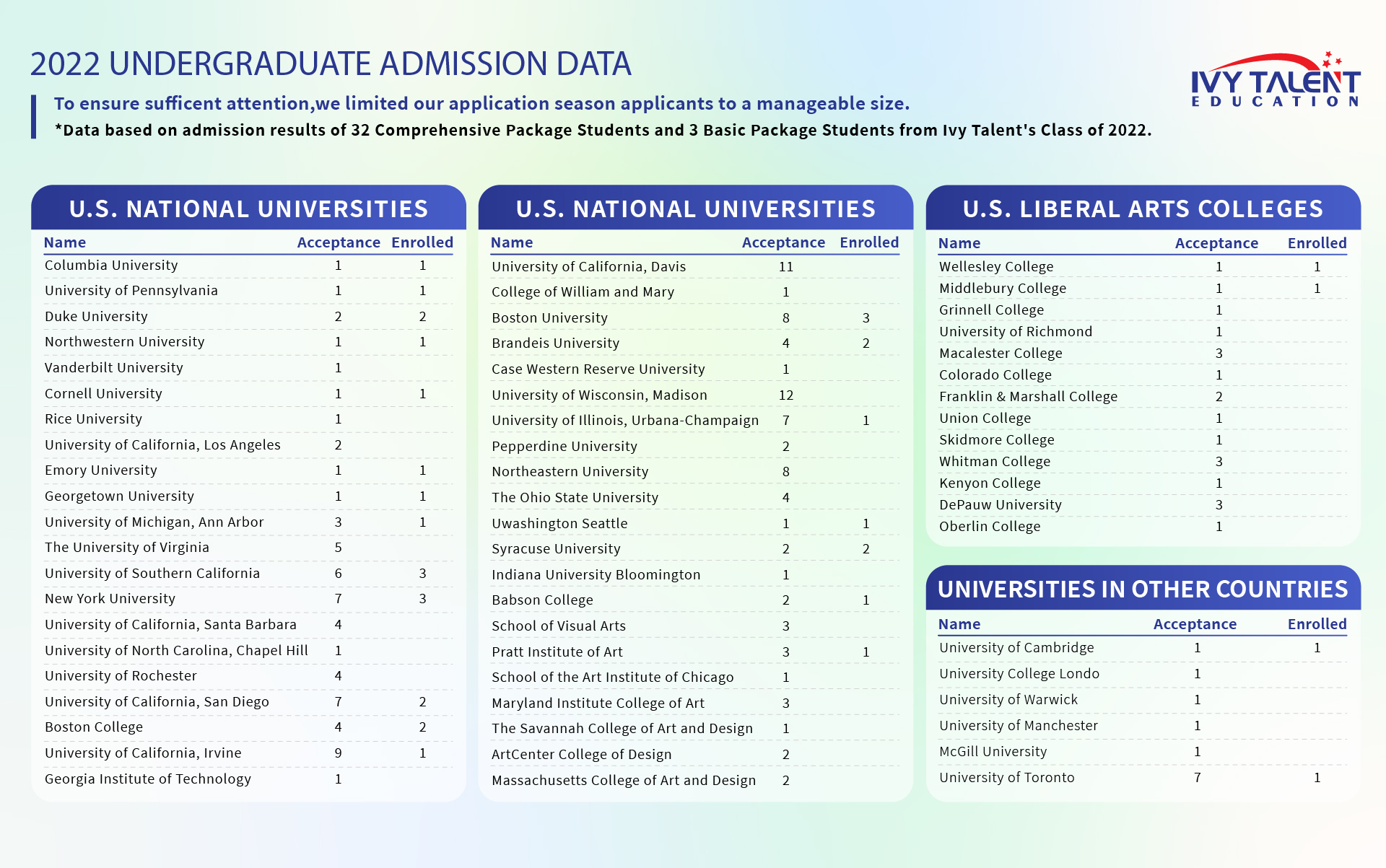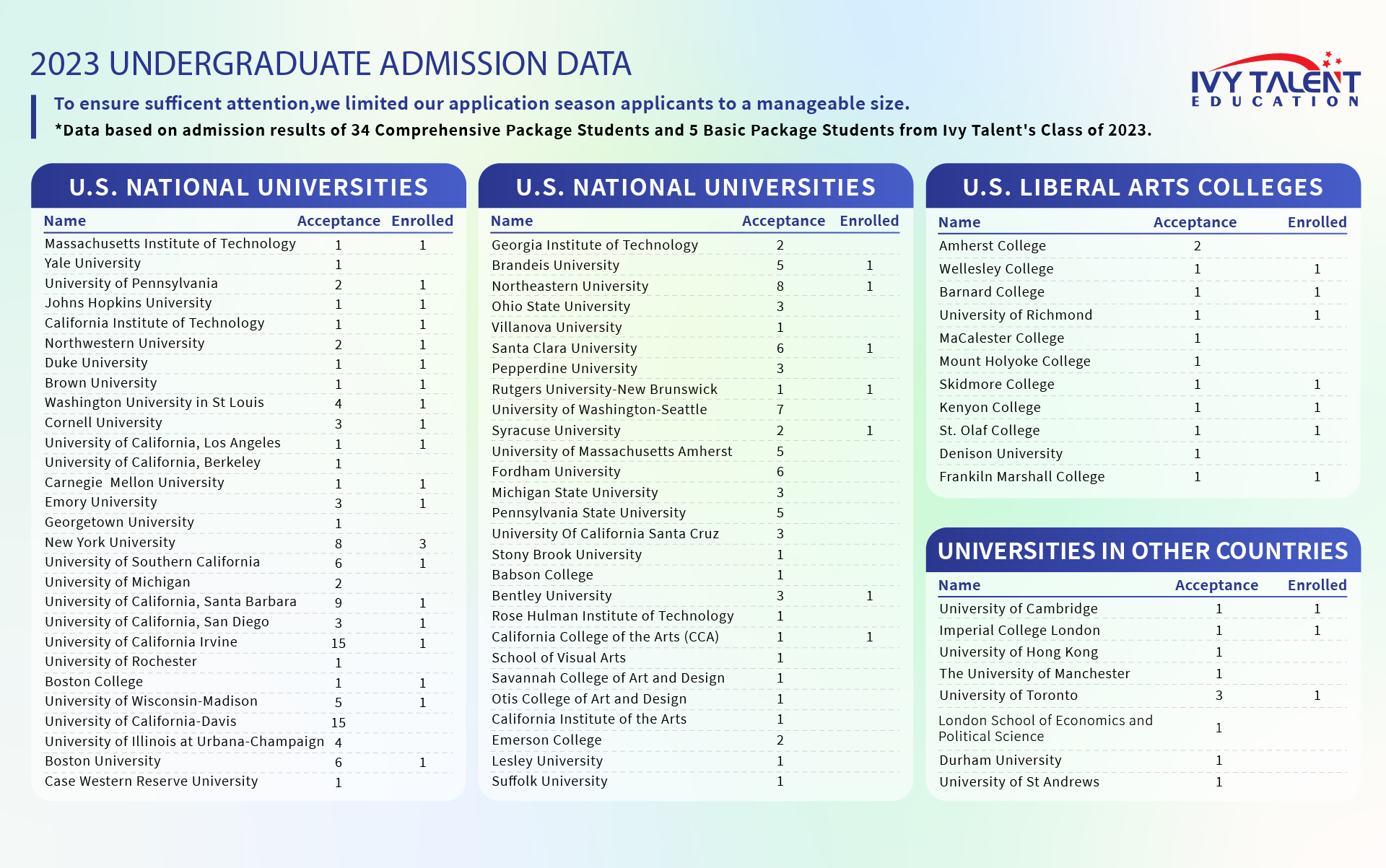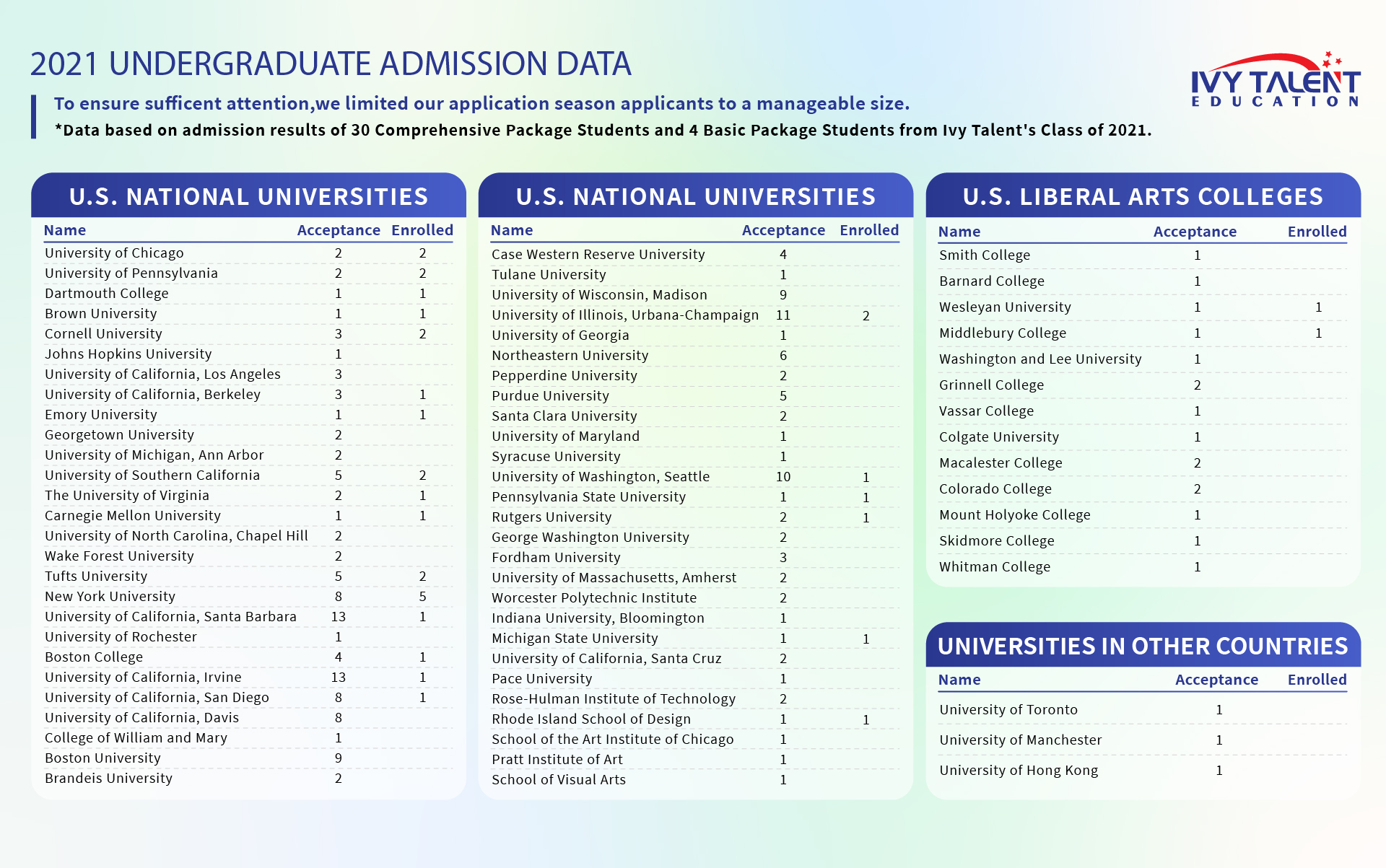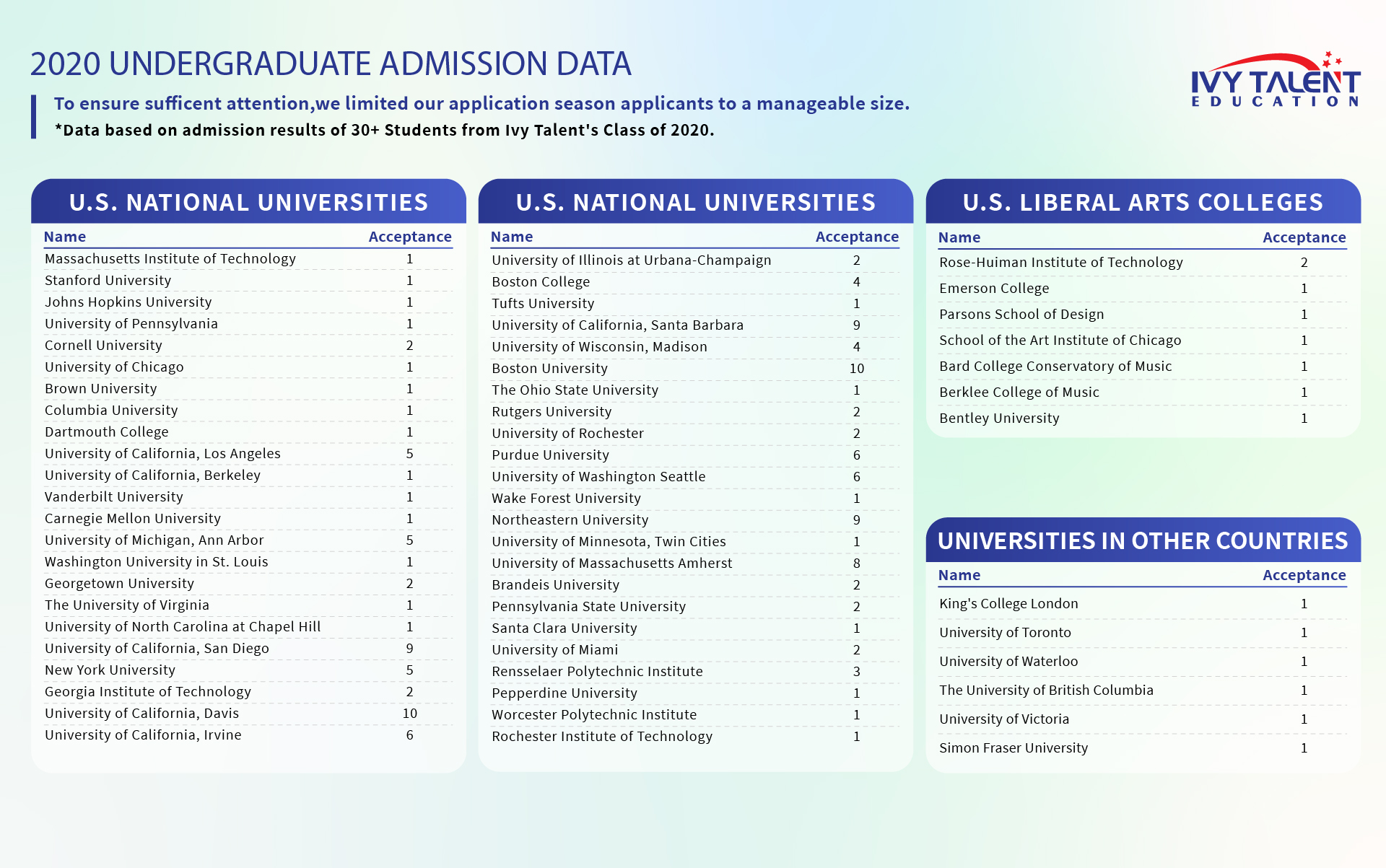 Since 2013, Ivy Talent has provided expert college planning and preparation services to students around the world. Over the years, we’ve guided more than 1000 students to successful admissions at top universities across the U.S., U.K., Canada, and beyond.